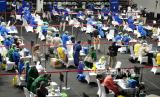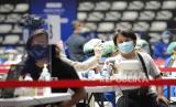 Suasana vaksinasi Covid-19 kepada awak media di Hall Basket Senayan, komplek Gelora Bung Karno, Jakarta, Kamis (25/2). Sebanyak 1.838 wartawan akan menjalani vaksinasi Covid-19 di GBK hari ini. Secara total, terdapat 5.512 orang awak media massa di DKI Jakarta akan mendapatkan vaksin mulai dari hari Rabu (25/2) hingga Sabtu (27/2) mendatang. Republika/Thoudy Bada (FOTO : Republika/Thoudy Badai)