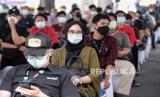 Sejumlah awak media menunggu giliran vaksin Covid-19 di Hall Basket Senayan, komplek Gelora Bung Karno, Jakarta, Kamis (25/2). Sebanyak 1.838 wartawan akan menjalani vaksinasi Covid-19 di GBK hari ini. Secara total, terdapat 5.512 orang awak media massa di DKI Jakarta akan mendapatkan vaksin mulai dari hari Rabu (25/2) hingga Sabtu (27/2) mendatang. Republika/Thoudy Bada (FOTO : Republika/Thoudy Badai)