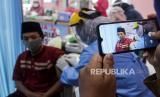 REPUBLIKA.CO.ID, SIDOARJO -- Petugas kesehatan menyuntikkan vaksin COVID-19 kepada guru, di puskesmas Kota Sidoarjo, Jawa Timur, Kamis (25/2/2021). Vaksinasi yang diikuti 150 guru tersebut bertujuan untuk pencegahan COVID-19 dan mempercepat pembelajaran tatap muka serta belajar-mengajar dengan aman dan nyaman. ANTARA FOTO/Umarul Faruq/hp.