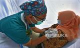 Petugas kesehatan menyuntikkan vaksin COVID-19 kepada guru di puskesmas Kota Sidoarjo,, Jawa Timur, Kamis (25/2). Vaksinasi yang diikuti 150 guru tersebut bertujuan untuk pencegahan COVID-19 dan mempercepat pembelajaran tatap muka serta belajar-mengajar dengan aman dan nyaman. (FOTO : ANTARA/Umarul Faruq)