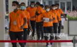 Sejumlah penggawa Timnas sepak bola U-23 berjalan menuju ruang vaksinasi COVID-19 di Istora Senayan, Gelora Bung Karno (GBK), Jakarta, Jumat (26/2). Kementerian Pemuda dan Olahraga (Kemenpora) bersama Kementerian Kesehatan (Kemenkes) melakukan vaksinasi COVID-19 perdana kepada insan olah raga nasional dengan menyasar 820 orang, termasuk atlet, pelatih dan tenaga kesehatan dari 40 cabang olahraga (cabor). (FOTO : ADITYA PRADANA PUTRA/ANTARA )