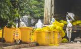 Petugas kebersihan Rumah Sakit COVID-19 Wisma Atlet memasukan limbah B3 ke dalam truk sampah di Jakarta, Jumat (26/2). (FOTO : ANTARA/Muhammad Adimaja)