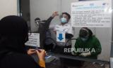 Petugas menjelaskan kepada calon penumpang Kereta Api (KA) cara melakukan tes deteksi COVID-19 dengan metode GeNose C19, di Stasiun KA Madiun, Jawa Timur, Ahad (28/2). (FOTO : SISWOWIDODO/ANTARA )