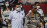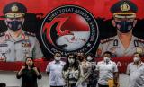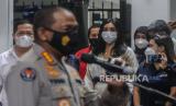 Kabid Humas Polda Metro Jaya Kombes Pol Yusri Yunus (kanan) memberikan keterangan saat rilis kasus narkotika yang menjerat Selebgram Millen Cyrus (kiri) di Mapolda Metro Jaya, Jakarta, Senin (1/3). Kepolisian tidak melakukan penahan terhadap Millen Cyrus pasca terbukti positif mengonsumsi psikotropika jenis Benzo pada Ahad (28/2) dan menyerahkannya kepada Badan Narkotika Nasional Kota (BNNK) Jakarta Selatan karena yang bersangkutan masih berstatus rawat jalan rehabilitasi dengan mengonsumsi clozapine, obat antipsikotik, akibat kasus narkoba yang menjeratnya pada November 2020. Republika/Putra M. Akbar (FOTO : Republika/Putra M. Akbar)