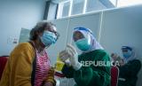 Petugas medis melakukan penyaringan (screening) kepada seorang warga lanjut usia (lansia) penerima vaksin COVID-19 di Rumah Sakit Umum Daerah (RSUD) Bung Karno, Solo, Jawa Tengah, Senin (1/3/2021). Menurut data Dinas Kesehatan Kota Solo, kuota vaksin COVID-19 Sinovac tahap kedua untuk lansia atau warga berusia di atas 60 tahun telah penuh dengan jumlah pendaftar melalui aplikasi daring mancapai 6.800 orang. (FOTO : MOHAMMAD AYUDHA/ANTARA FOTO)