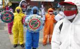 REPUBLIKA.CO.ID, SOLO -- Relawan memakai pakaian hazmat dan mengusung poster untuk memperingati Setahun Pandemi COVID-19 di Indonesia saat aksi di Jalan Gatot Subroto, Solo, Jawa Tengah, Selasa (2/3).