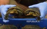 Petugas menunjukan kura-kura saat gelar barang bukti penggagalan pemasukan satwa tanpa dokumen di Balai Besar Karantina Pertanian Surabaya di Sidoarjo, Jawa Timur, Selasa (2/3/2021). Sebanyak 633 satwa yakni enam Kakatua Jambul Putih, 19 Nuri Tanimbar, 313 Jalak Rio-rio, 10 Merpati Hitam Sulawesi dan 285 Kura-kura yang berasal dari Makassar, Sulawesi Selatan diamankan petugas karena tidak dilengkapi dokumen kesehatan dari daerah asal. (FOTO : Zabur Karuru/ANTARA )