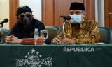 Ketua Umum Pengurus Besar Nahdlatul Ulama (PBNU) Said Aqil Siroj (kanan) bersama Gus Miftah (kiri) saat menyampaikan konferensi pers di gedung PBNU, Jakarta, Selasa (2/3). PBNU mengapresiasi langkah pemerintah yang mencabut lampiran Peraturan Presiden (Perpres) Nomor 10 Tahun 2021 tentang Bidang Usaha Penanaman Modal yang mengatur soal investasi minuman keras. (FOTO : Republika/Thoudy Badai)