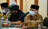 REPUBLIKA.CO.ID, JAKARTA -- Ketua Umum PBNU KH Said Aqil Siroj didampingi Sekjen Helmy Faizal Zaini dan Pendakwah NU Gus Miftah memberikan keterangan pers tentang Lampiran Peraturan Presiden (Perpres) Nomor 10 Tahun 2021 tentang Bidang Usaha Penanaman Modal yang mengatur soal investasi minuman keras di kantor pusat PBNU, Jakarta, Selasa (2/3/2021).
