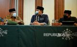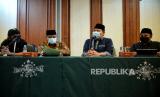 Ketua Umum Pengurus Besar Nahdlatul Ulama (PBNU) Said Aqil Siroj (kiri) didampingi Sekjen PBNU Helmy Faishal Zaini (tengah) dan Ustadz Yusuf Mansur (kanan) saat menyampaikan konferensi pers di gedung PBNU, Jakarta, Selasa (2/3). PBNU mengapresiasi langkah pemerintah yang mencabut lampiran Peraturan Presiden (Perpres) Nomor 10 Tahun 2021 tentang Bidang Usaha Penanaman Modal yang mengatur soal investasi minuman keras. Republika/Thoudy Badai (FOTO : Republika/Thoudy Badai)