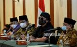 Ketua Umum Pengurus Besar Nahdlatul Ulama (PBNU) Said Aqil Siroj (kanan) didampingi KetuabPBNU Marsudi Syuhud (kedua kiri), Gus Miftah (kedua kanan) saat menyampaikan konferensi pers di gedung PBNU, Jakarta, Selasa (2/3). PBNU mengapresiasi langkah pemerintah yang mencabut lampiran Peraturan Presiden (Perpres) Nomor 10 Tahun 2021 tentang Bidang Usaha Penanaman Modal yang mengatur soal investasi minuman keras. Republika/Thoudy Badai (FOTO : Republika/Thoudy Badai)