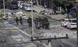 Personel militer mengamankan perimeter setelah protes terhadap kudeta militer di Yangon, Myanmar, 02 Maret 2021. Menteri luar negeri Perhimpunan Bangsa-Bangsa Asia Tenggara (ASEAN) diperkirakan akan mengadakan pertemuan khusus tentang krisis politik Myanmar pada 02 Maret, di tengah ketegangan yang meningkat di negara itu antara pengunjuk rasa anti-kudeta dan pasukan keamanan. (FOTO : EPA-EFE/LYNN BO BO)