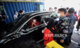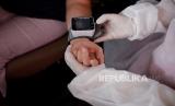 Warga kelompok lanjut usia (lansia) mengecek kesehatan sebelum mengikuti vaksinasi covid-19 secara drive thru di halaman Blok C Kemayoran, Jakarta, Rabu (3/3). (FOTO : Republika/Thoudy Badai)