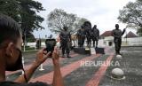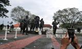 Pengunjung memotret dengan gawai patung gerilya Panglima Besar Jenderal Soedirman dipajang di halaman pintu masuk Benteng Vredeburg, Yogyakarta, Rabu (3/3). Patung Panglima Besar Tidak Pernah Sakit ini karya pematung Yusman. Dipasang di pintu masuk Benteng Vredeburg dalam rangka memperingati serangan umum 1 Maret di Yogyakarta. (FOTO : Wihdan Hidayat / Republika)