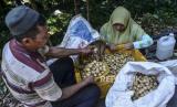 Petani mengumpulkan duku hasil panen di Kertasari, Kabupaten Ciamis, Jawa Barat, Rabu (3/5/2021). Menurut petani hasil panen duku turun dari biasanya mendapatkan dua kuintal duku per pohon, kini hanya bisa satu kuital akibat musim penghujan, bahkan harga duku ditingkat petani turun menjadi Rp10.000 per klilogram dari biasanya Rp12.500 per kilogram. (FOTO : ADENG BUSTOMI/ANTARA )