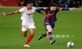 Lionel Messi menggiring bola pada laga leg kedua Piala Raja antara FC Barcelona melawan Sevilla CF di Camp Nou stadium, Barcelona, Spanyol, Kamis (4/3) dini hari WIB. (FOTO : Reuters/ALBERT GEA)
