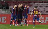 Tim Barcelona merayakan gol ketiga mereka pada laga leg kedua Piala Raja antara FC Barcelona melawan Sevilla CF di Camp Nou stadium, Barcelona, Spanyol, Kamis (4/3) dini hari WIB. (FOTO : Reuters/ALBERT GEA)