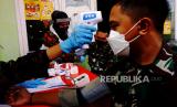 Petugas medis memeriksa suhu tubuh karyawan PT Kereta Api Indonesia (KAI) Daerah Operasi (Daop) 7 Madiun sebelum menerima suntikan vaksin COVID-19 di Puskesmas Oro oro Ombo Kota Madiun, Jawa Timur, Kamis (4/3/2021). Vaksinasi massal karyawan dan karyawati PT KAI tersebut dilakukan di dua tempat yaitu Puskesmas Oro oro Ombo dan Tawangrejo untuk mencegah kerumunan. ANTARA FOTO/Siswowidodo/rwa. (FOTO : ANTARA FOTO)