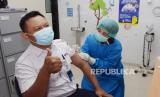 Petugas kesehatan menyuntikkan vaksin COVID-19 kepada seorang pedagang di Pasar Raya Padang, Sumatera Barat, Kamis (4/3/2021). Pemkot Padang melalui Dinas Perdagangan melakukan vaksin COVID-19 kepada pedagang, petugas pelayan publik, dan warga di Pasar Raya Padang dengan target 2.500 orang selama dua hari. ANTARA FOTO/Iggoy el Fitra/rwa. (FOTO : ANTARA FOTO)