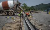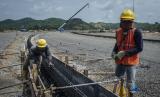 Pekerja menyelesaikan pembangunan saluran drainase proyek Mandalika International Street Circuit di Kawasan Ekonomi Khusus (KEK) Mandalika, Pujut, Praya, Lombok Tengah, Nusa Tenggara Barat, Kamis (4/3/2021). Berdasarkan data Mandalika Grand Prix Association (MGPA), ITDC dan PT PP per Februrari 2021 progres pembangunan lintasan sirkuit MotoGP itu secara kumulatif mencapai 53,27 persen dan ditargetkan selesai pada pertengahan 2021. (FOTO : ANTARA/Aprillio Akbar)