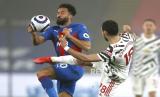 Daniel James (kiri), dan Christian Benteke dari Crystal Palace berebut bola pada laga Liga Premier Inggris antara Crystal Palace melawan Manchester United di Stadion Selhurst Park, London, Inggris, Kamis (4/3) dini hari WIB. (FOTO : AP/Matthew Childs/Pool Reuters)