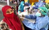 Pedagang mengikuti vaksininasi massal di Pasar Beringharjo, Yogyakarta, Kamis (4/3). Program vaksinasi tahap ke dua di Yogyakarta hingga hari ke tiga belum memenuhi target. Persentase keikutsertaan penyuntikan vaksin Covid-19 sekitar 71 persen dari sasaran. (FOTO : Wihdan Hidayat / Republika)