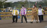 Presiden Joko Widodo (kiri) berbincang dengan Menteri Pekerjaan Umum Basuki Hadimuljono (kedua kiri) disaksikan Gubernur Banten Wahidin Halim (kanan) usai meresmikan Waduk Sindangheula di Pabuaran, Serang, Banten, Kamis (4/2/2021). Waduk yang dibangung sejak tahun 2015 dengan biaya sekitar Rp458 miliar itu mampu menampung air sebanyak 9,3 juta meter kubik berfungsi untuk mengendalikan banjir, menjadi sumber air baku industri serta untuk mengairi 1.280 hektare sawah yang ada di Serang dan sekitarnya. (FOTO : ASEP FATHULRAHMAN/ANTARA FOTO)