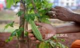 Petugas PPSU Kel Cipinang Melayu Hasan menunjukan tanaman pare yang di tanam dengan memanfaatkan lahan kosong kolong tol Becakayu, Pangkalan Jati, Jakarta, Jumat (5/3). (FOTO : Prayogi/Republika.)
