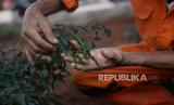 Petugas PPSU Kel Cipinang Melayu Hasan menunjukan cabai yang di tanam dengan memanfaatkan lahan kosong kolong tol Becakayu, Pangkalan Jati, Jakarta, Jumat (5/3). (FOTO : Prayogi/Republika.)