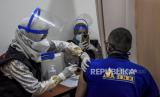 Vaksinator menyuntikan vaksin Covid-19 ke pedagang di Balubur Town Square, Jalan Tamansari, Kota Bandung, Jumat (5/3). (FOTO : ABDAN SYAKURA/REPUBLIKA)