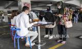 Sejumlah pedagang melakukan tahap verifikasi dan pemeriksaan kesehatan sebelum disuntik vaksin Covid-19 di Balubur Town Square, Jalan Tamansari, Kota Bandung, Jumat (5/3). Sedikitnya 250 pedagang dan karyawan menerima vaksin Covid-19 Sinovac dosis pertama pada pelaksanaan vaksinasi tahap kedua di Kota Bandung yang ditujukan bagi lansia dan petugas publik seperti aparatur sipil negara (ASN), anggota TNI dan Polri, pedagang pasar, pekerja seni, pekerja pariwisata dan sejenisnya. (FOTO : ABDAN SYAKURA/REPUBLIKA)