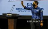 Ketua umum Partai Demokrat Agus Harimurti Yudhoyono (AHY) melambaikan tangan usai memberikan keterangan pers di Kantor DPP Partai Demokrat, Jakarta, Jumat (5/3). AHY mengatakan bahwa Kongres Luar Biasa (KLB) yang digelar di Deli Serdang, Sumatera Utara ilegal dan juga inkonstitusional serta tidak sesuai dengan AD/ART yang telah diakui pemerintah. Republika/Putra M. Akbar (FOTO : Republika/Putra M. Akbar)