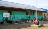 Dua orang murid di depan bangunan sekolah sebelum waktu belajar dimulai di SD Al Maarif 1 Kampung Maibo, Kabupaten Sorong, Papua Barat, Sabtu (6/3/2021). Sejumlah sekolah di Provinsi Papua Barat sudah mulai melakukan pembelajaran tatap muka setelah hampir setahun pembelajaran dilakukan secara dalam jaringan (daring) atau luar jaringan (luring) selama masa Pandemi COVID-19. (FOTO : ANTARA FOTO)