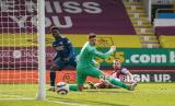 Kiper Burnley Nick Pope (kiri) menghalau bola dari Pierre-Emerick Aubameyang (kanan) pada laga antara Burnley FC dan Arsenal FC di Burnley, Inggris, Sabtu (6/3). (FOTO : EPA-EFE/Jon Super / POOL )