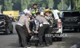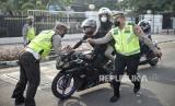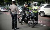 Petugas Kepolisian melakukan razia pengendara motor yang menggunakan knalpot bising di kawasan Monumen Nasional (Monas), Jakarta, Ahad (7/3). Direktorat Lalu LintasĀ Polda Metro JayaĀ mengeluarkan kebijakan terkait larangan kendaraan bermotor berknalpot bising melintas di kawasan Monas pada hari Sabtu dan Minggu guna memberikan kenyamanan bagi warga yang hendak berolahraga di area tersebut. (FOTO : Republika/Thoudy Badai)