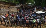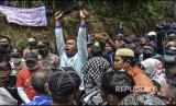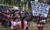 Sejumlah warga yang menolak menyaksikan dan berdialog langsung dengan Wakil Gubernur Jabar Uu Ruzhanul Ulum saat sidak lokasi tambang pasir di Kampung Pasir Ipis, Desa Padakembang, Kabupaten Ciamis, Jawa Barat, Ahad (7/3). Sidak tersebut untuk menghentikan sementara aktivitas pertambang galian pasir di Leuweung Keusik, Gunung Galunggung, karena diduga ada pemalsuan dokumen Izin Usaha Penambangan (IUP) CV Trican yang dikeluarkan oleh Pemprov Jabar pada 2019. (FOTO : Adeng Bustomi)