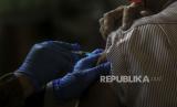 Tenaga kesehatan saat menyuntikan vaksin Covid-19 kepada warga lansia di SD 04 Cilandak Barat, Jakarta, Senin (8/3). Kementerian Kesehatan menggelar vaksinasi Covid-19 secara massal bagi kelompok lansia selama empat bulan di DKI Jakarta dengan target 1.000 orang per hari. Republika/Putra M. Akbar (FOTO : Republika/Putra M. Akbar)