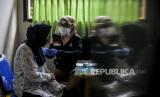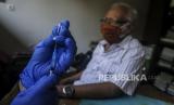 Tenaga kesehatan saat akan menyuntikan vaksin Covid-19 kepada warga lansia di SD 04 Cilandak Barat, Jakarta, Senin (8/3). Kementerian Kesehatan menggelar vaksinasi Covid-19 secara massal bagi kelompok lansia selama empat bulan di DKI Jakarta dengan target 1.000 orang per hari. Republika/Putra M. Akbar (FOTO : Republika/Putra M. Akbar)