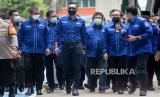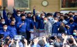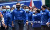 Ketua Umum Partai Demokrat Agus Harimurti Yudhoyono (AHY) saat tiba di Kantor Direktorat jenderal aAdministrasi Hukum Umum Kementerian Hukum dan HAM, Kuningan Jakarta, Senin (8/3). Tujuan kedatangan AHY beserta jajaran pengurus tingkat daerah tersebut ingin menyampaikan pada Kemenkumham, jika kongres luar biasa (KLB) yang digelar kubu Moeldoko di Deli Serdang, Sumatera Utara (Sumut), ilegal. (FOTO : Prayogi/Republika.)