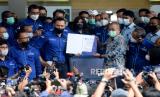 Ketua Umum Partai Demokrat Agus Harimurti Yudhoyono (AHY) menyerahkan berkas kepada Dirjen Administrasi Hukum Umum Kementerian Hukum dan HAM Cahyo Rahadian Muzhar usai menyambangi Kantor Direktorat jenderal Administrasi Hukum Umum Kementerian Hukum dan HAM, Kuningan Jakarta, Senin (8/3). Tujuan kedatangan AHY beserta jajaran pengurus tingkat daerah tersebut ingin menyampaikan pada Kemenkumham, jika kongres luar biasa (KLB) yang digelar kubu Moeldoko di Deli Serdang, Sumatera Utara (Sumut), ilegal.Prayogi/Republika. (FOTO : Prayogi/Republika.)