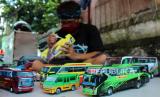 Perajin membuat miniatur bus dari bahan kertas tiga dimensi (3D) di Jakaria Miniatur, Kota Bogor, Jawa Barat, Senin (8/3). (FOTO : ARIF FIRMANSYAH/ANTARA FOTO)