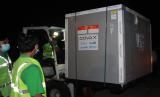 Pekerja kargo menurunkan kontainer berisi vaksin COVID-19 AstraZeneca dari atas pesawat setibanya di Bandara Internasional Soekarno Hatta, Tangerang, Banten, Senin (8/3). Sebanyak 1.113.600 vaksin virus corona (COVID-19) jadi asal perusahaan farmasi Inggris AstraZeneca tiba di Indonesia melalui skema kerja sama multilateral Aliansi Global untuk Vaksin dan Imunisasi (GAVI) COVAX Facility yang selanjutkan akan diproses di Bio Farma, Kota Bandung. (FOTO : MUHAMMAD IQBAL/ANTARA )