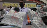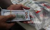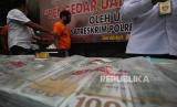 REPUBLIKA.CO.ID, SURABAYA -- Polisi menunjukan barang bukti saat ungkap kasus peredaran uang palsu di Polrestabes Surabaya, Jawa Timur, Senin (8/3/). Polrestabes Surabaya menangkap tersangka IWW (42) dan SMJ (56) atas kasus dugaan mengedarkan uang palsu serta mengamankan barang bukti uang palsu pecahan 100 dolar Amerika Serikat sebanyak 15 ribu lembar.