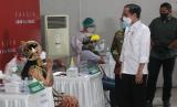 REPUBLIKA.CO.ID, YOGYAKARTA -- Presiden RI Joko Widodo meninjau vaksinasi covid-19 untuk seniman di Padepokan Seni Bagong Kussudihardjo, Bantul, Rabu (3/10/2021).