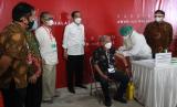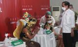 Dalam kunjungan itu Presiden Joko Widodo menyaksikan secara langsung proses vaksinasi COVID-19 bagi seniman di Yogyakarta.