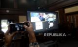 Jurnalis mengambil gambar layar yang menampilkan Mantan Sekretaris Mahkamah Agung (MA) Nurhadi bersama Menantunya Rezky Herbiyono sebelum mengikuti sidang pembacaan putusan secara virtual di Pengadilan Tipikor, Jakarta, Rabu (10/3). Majelis hakim menjatuhkan pidana penjara 6 tahun dan denda Rp500 juta subsider 3 bulan kurungan kepada terdakwa mantan Sekretaris Mahkamah Agung (MA) Nurhadi. Selain Nurhadi, Rizky Herbiyono yang juga terdakwa suap pengurusan perkara di MA dan gratifikasi divonis dengan 6 tahun penjara dan denda Rp500 juta subsider 3 bulan kurungan.Prayogi/Republika. (FOTO : Prayogi/Republika.)