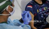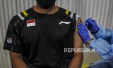 REPUBLIKA.CO.ID, JAKARTA -- Atlet Wushu Indonesia M. Daffa Golden Boy saat disuntik vaksin Covid-19 di Rumah Sakit Olahraga Nasional, Cibubur, Jakarta, Jumat (12/3).