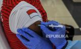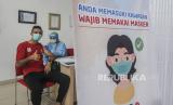 Tenaga kesehatan saat menyuntikan vaksin Covid-19 di Rumah Sakit Olahraga Nasional, Cibubur, Jakarta, Jumat (12/3). Kementerian Pemuda dan Olahraga bersama Kementerian Kesehatan melakukan vaksinasi Covid-19 dosis ke-2 kepada insan olahraga nasional dengan menyasar 820 orang secara bertahap. (FOTO : Republika/Putra M. Akbar)