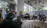 Sejumlah atlet dan ofisial menunggu pemeriksaan kesehatan sebelum disuntik vaksin Covid-19 di Rumah Sakit Olahraga Nasional, Cibubur, Jakarta, Jumat (12/3). Kementerian Pemuda dan Olahraga bersama Kementerian Kesehatan melakukan vaksinasi Covid-19 dosis ke-2 kepada insan olahraga nasional dengan menyasar 820 orang secara bertahap. Republika/Putra M. Akbar (FOTO : Republika/Putra M. Akbar)