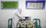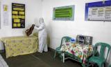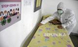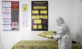 Warga merapikan tempat tidur ruang isolasi darurat di Posko Terpadu Covid-19 RW 02, Kelurahan Sarijadi, Kecamatan Sukasari, Kota Bandung, Jumat (12/3). Warga RW 02 berinisiatif mengubah gedung serba guna menjadi posko terpadu covid-19 yang menyediakan ruang isolasi darurat, serta menyediakan sembako dan vitamin bagi warga yang terdampak Covid-19 dan secara rutin memberikan layanan penyemprotan disinfektan. (FOTO : REPUBLIKA/ABDAN SYAKURA)